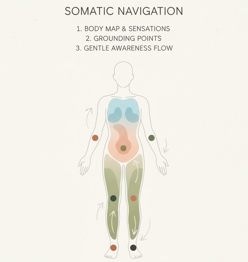 Somatic navigation brings all these systems together. It creates a structured, sensory map that guides your mind downward — from thoughts into the body, from the body into rest.